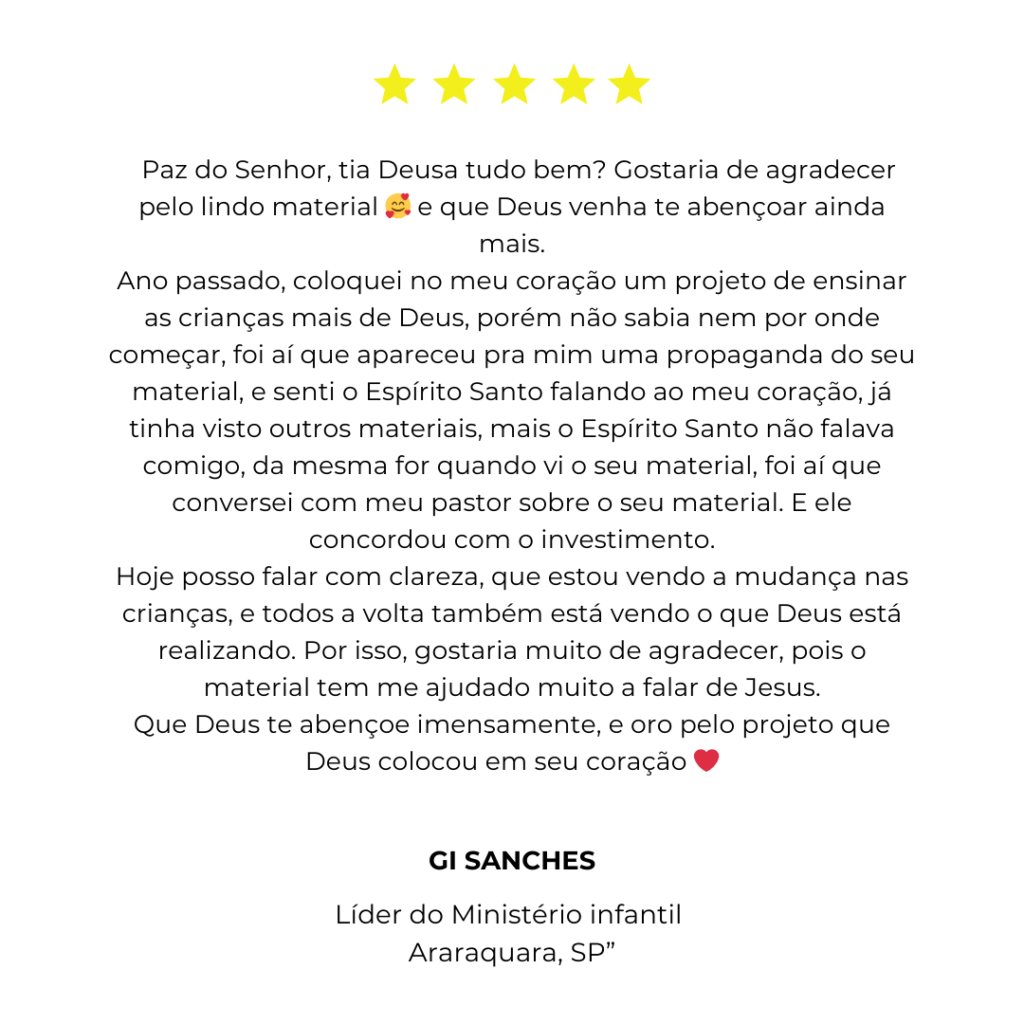 Sou idealizadora do grupo “Ministério Infantil Sem Complicações – Tia Deusa”, um dos maiores grupos sobre Ministério Infantil no Facebook, criado para apoiar líderes e professores com conteúdos bíblicos, práticos e acessíveis.